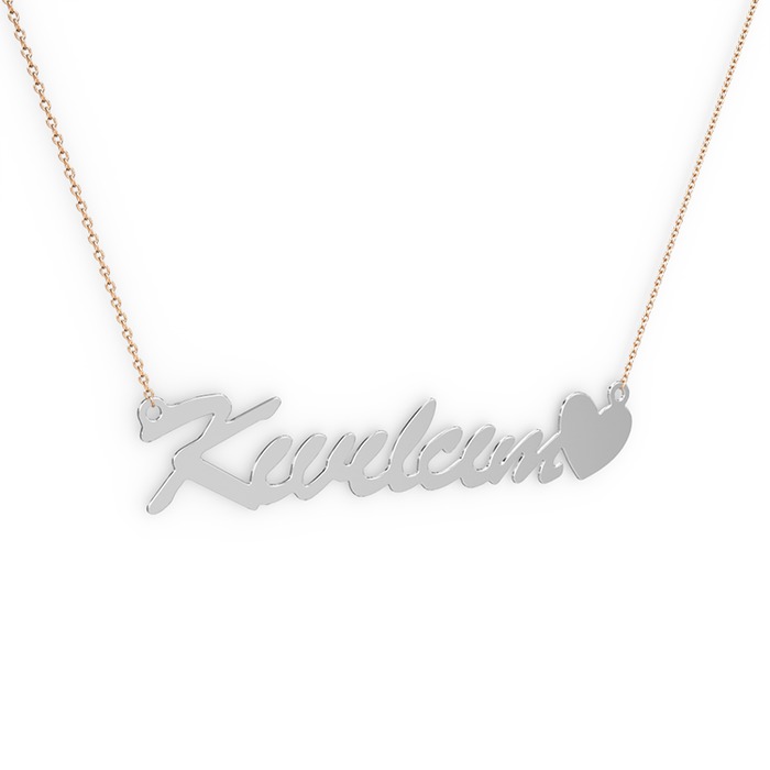 14 ayar beyaz altın kolye (8 karakterli el yazısı, 40 cm gümüş rolo zincir)
