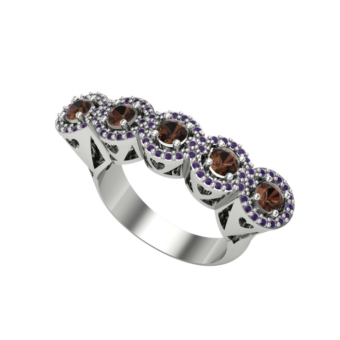 Dumanlı kuvars ve ametist 8 ayar beyaz altın yüzük