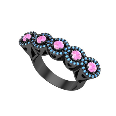 Pembe kuvars ve akuamarin 925 ayar siyah rodyum kaplama gümüş yüzük