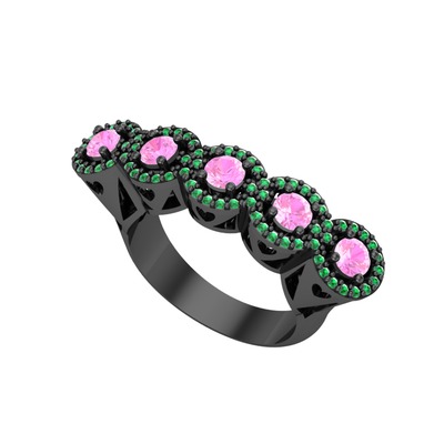 Pembe kuvars ve yeşil kuvars 925 ayar siyah rodyum kaplama gümüş yüzük