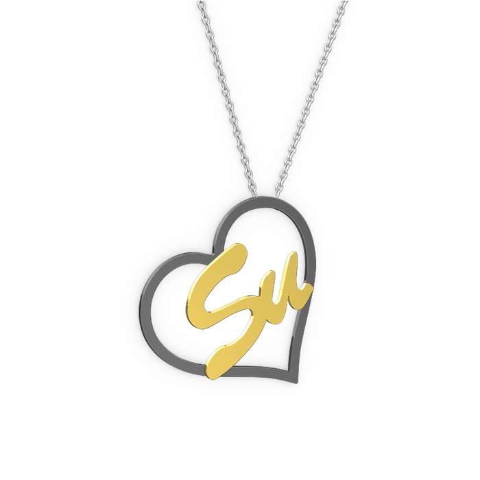 925 ayar siyah rodyum kaplama gümüş kolye (2 karakterli el yazısı, 40 cm beyaz altın rolo zincir)