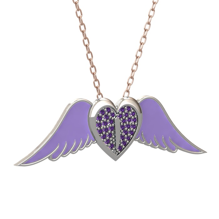 Ametist 14 ayar beyaz altın kolye (Menekşe mineli, 40 cm rose altın rolo zincir)