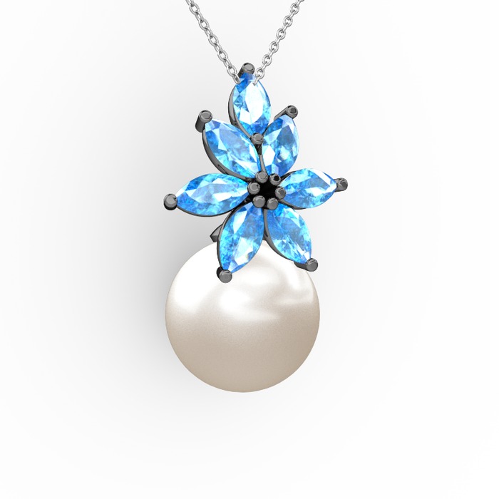 Inci ve akuamarin 925 ayar siyah rodyum kaplama gümüş kolye (40 cm beyaz altın rolo zincir)