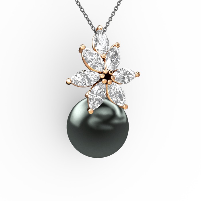 Siyah inci ve beyaz zirkon 8 ayar rose altın kolye (40 cm gümüş rolo zincir)