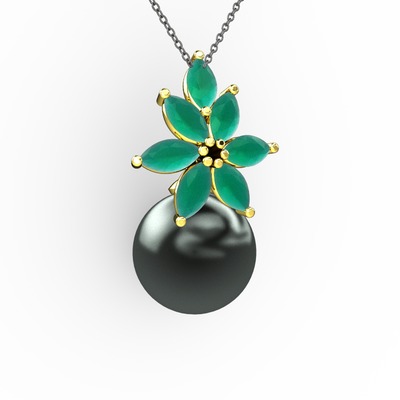 Siyah inci ve kök zümrüt 18 ayar altın kolye (40 cm gümüş rolo zincir)