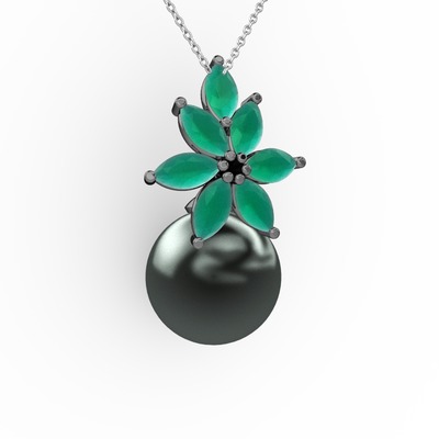 Siyah inci ve kök zümrüt 925 ayar siyah rodyum kaplama gümüş kolye (40 cm beyaz altın rolo zincir)