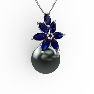 Siyah inci ve lab safir 18 ayar beyaz altın kolye (40 cm gümüş rolo zincir)