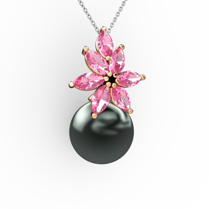Siyah inci ve pembe kuvars 18 ayar rose altın kolye (40 cm beyaz altın rolo zincir)