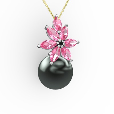 Siyah inci ve pembe kuvars 925 ayar gümüş kolye (40 cm altın rolo zincir)