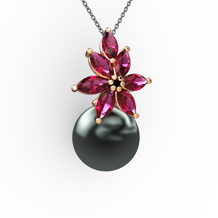 Siyah inci ve rodolit garnet 18 ayar rose altın kolye (40 cm gümüş rolo zincir)