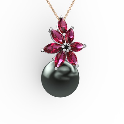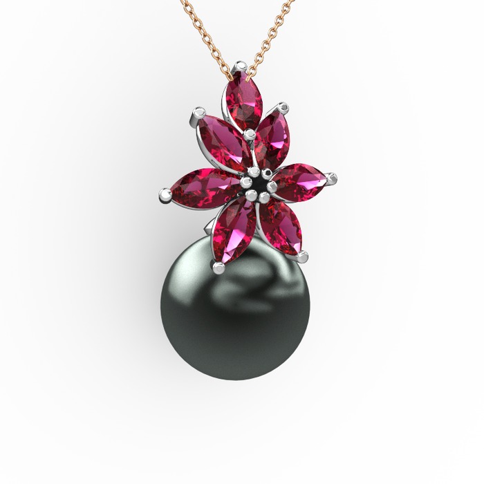 Siyah inci ve rodolit garnet 925 ayar gümüş kolye (40 cm rose altın rolo zincir)