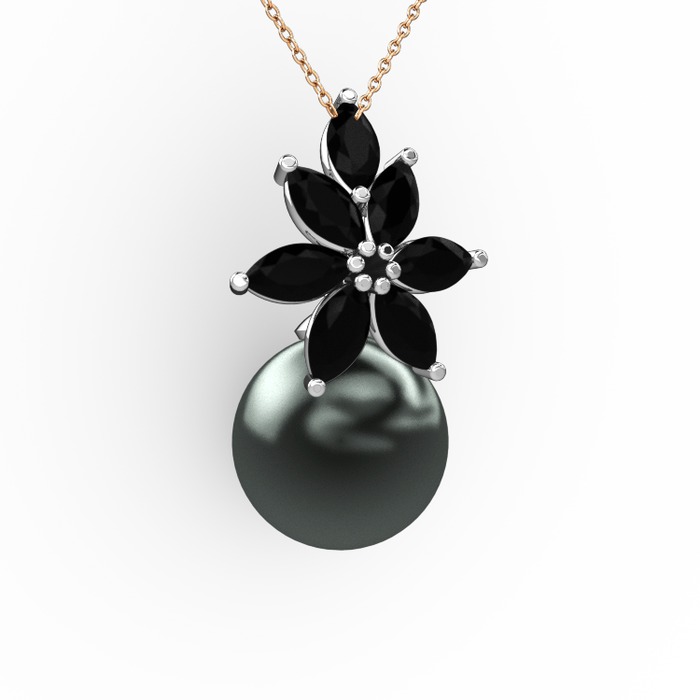 Siyah inci ve siyah zirkon 8 ayar beyaz altın kolye (40 cm rose altın rolo zincir)