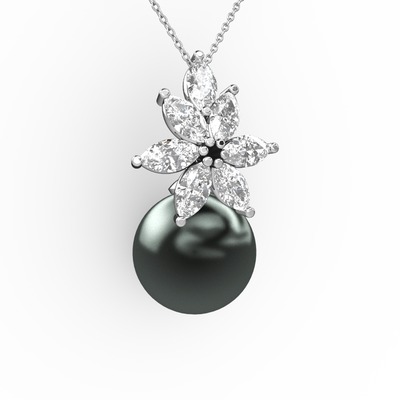 Siyah inci ve swarovski 925 ayar gümüş kolye (40 cm beyaz altın rolo zincir)
