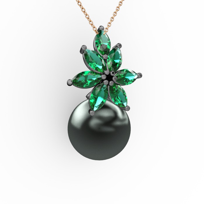 Siyah inci ve yeşil kuvars 925 ayar siyah rodyum kaplama gümüş kolye (40 cm rose altın rolo zincir)