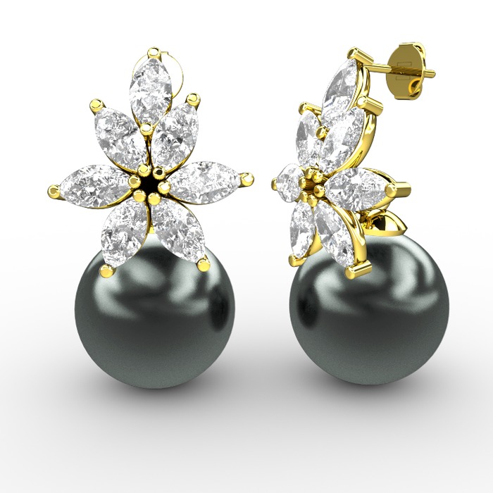 Siyah inci ve beyaz zirkon 14 ayar altın küpe
