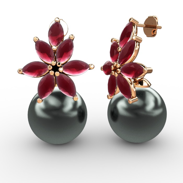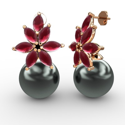 Siyah inci ve kök yakut 18 ayar rose altın küpe