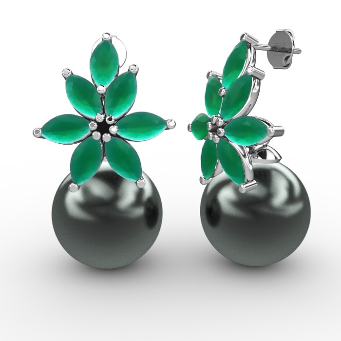 Siyah inci ve kök zümrüt 14 ayar beyaz altın küpe