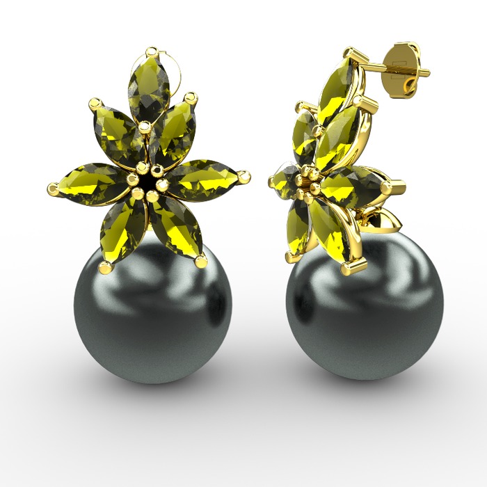 Siyah inci ve peridot 925 ayar altın kaplama gümüş küpe