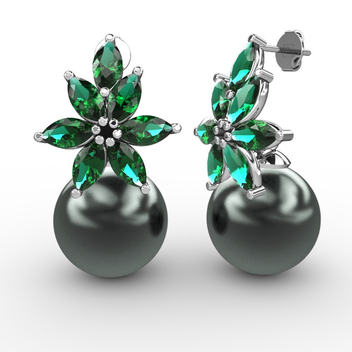 Siyah inci ve yeşil kuvars 8 ayar beyaz altın küpe