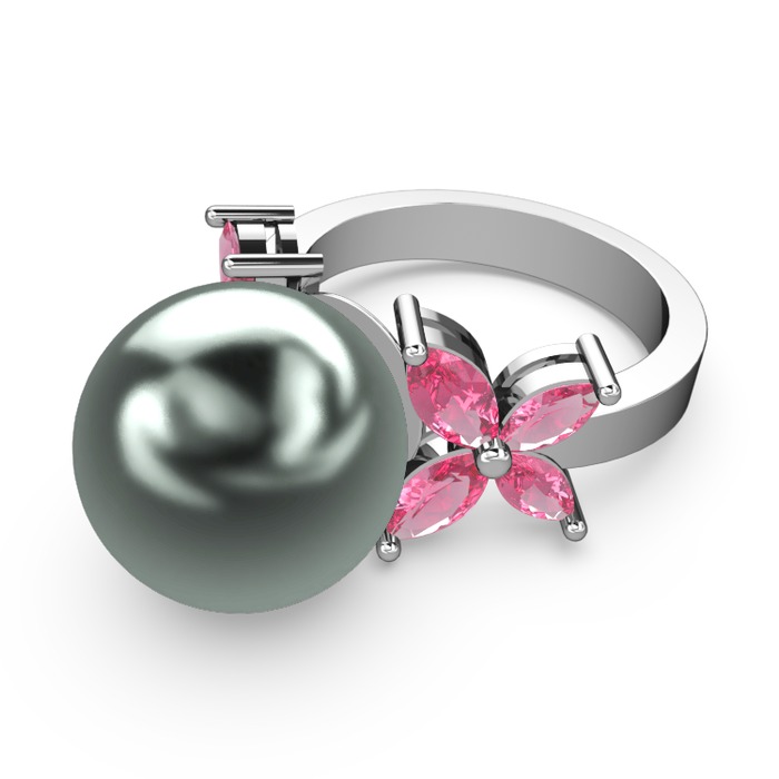 Siyah inci ve pembe kuvars 8 ayar beyaz altın yüzük