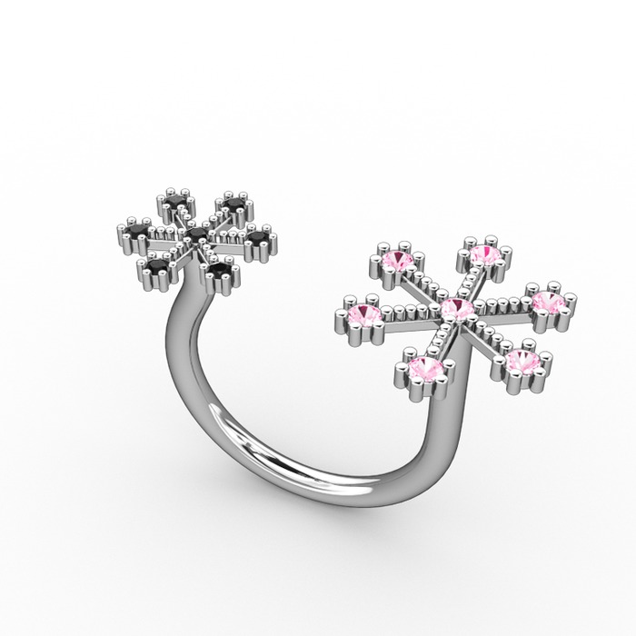 Pembe kuvars ve siyah zirkon 14 ayar beyaz altın yüzük