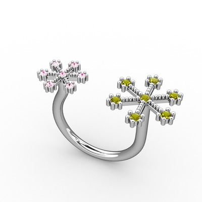 Peridot ve pembe kuvars 18 ayar beyaz altın yüzük