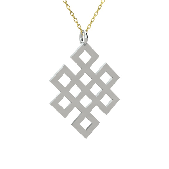 Budizm de ki en önemli sembollerden biri olan Shrivatsa’dan (sonsuz düğüm) ilham alınarak tasarlanan kolyemiz ile sonsuz bilgeliğinizi ve bütünlüğünüzü etrafınıza yansıtın. Shrivatsa sembolu 90 derecelik açılarlar ile iç içe geçen çizgilerden oluşmuştur. Hiç bir çizginin bir başlangıcı ve bitişi bulunmamaktadır. Bu formu sayesinde sonsuzluğu simgelemekyedir. Bu Sonsuz düğüm sembolu aynı zamanda kaderimizi karma ile birleştirmenin semboludur o yüzden bir diğer adı da Karma Sembolüdür. Detaylı Bilgi