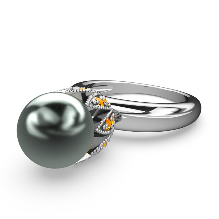 Siyah inci ve sitrin 18 ayar beyaz altın yüzük