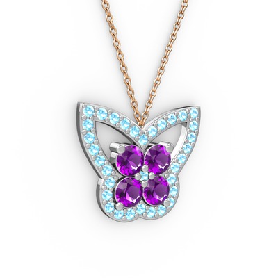 Akuamarin ve ametist 8 ayar beyaz altın kolye (40 cm rose altın rolo zincir)