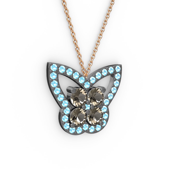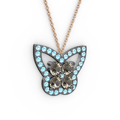 Akuamarin ve dumanlı kuvars 925 ayar siyah rodyum kaplama gümüş kolye (40 cm rose altın rolo zincir)