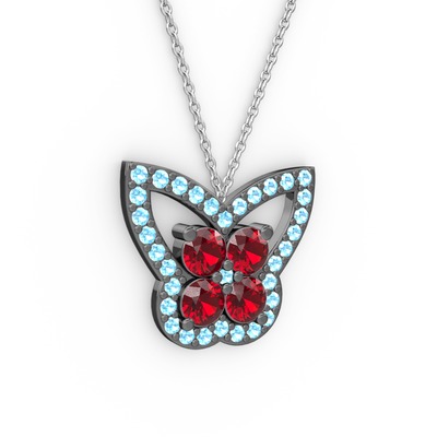 Akuamarin ve garnet 925 ayar siyah rodyum kaplama gümüş kolye (40 cm beyaz altın rolo zincir)
