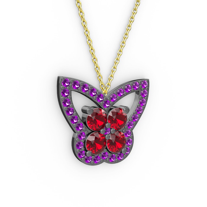 Ametist ve garnet 925 ayar siyah rodyum kaplama gümüş kolye (40 cm altın rolo zincir)