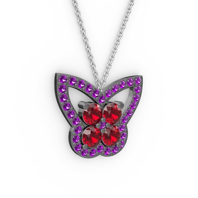 Ametist ve garnet 925 ayar siyah rodyum kaplama gümüş kolye (40 cm gümüş rolo zincir)