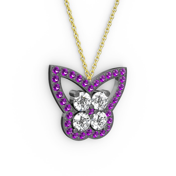 Ametist ve pırlanta 925 ayar siyah rodyum kaplama gümüş kolye (0.96 karat, 40 cm altın rolo zincir)