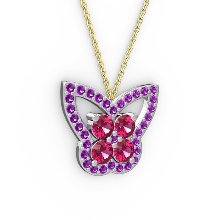 Ametist ve rodolit garnet 925 ayar gümüş kolye (40 cm altın rolo zincir)