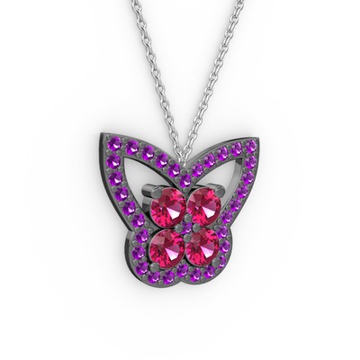 Ametist ve rodolit garnet 925 ayar siyah rodyum kaplama gümüş kolye (40 cm beyaz altın rolo zincir)