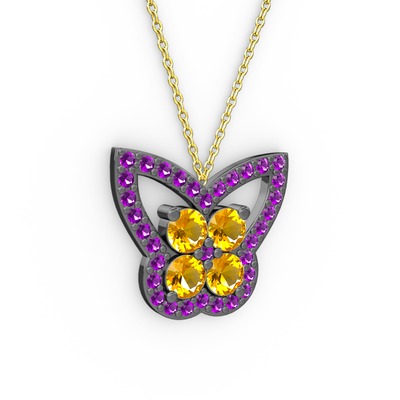 Ametist ve sitrin 925 ayar siyah rodyum kaplama gümüş kolye (40 cm altın rolo zincir)