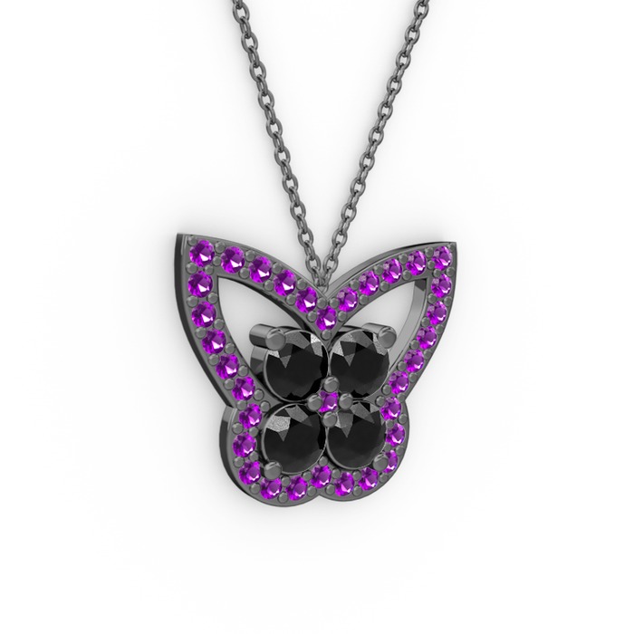 Ametist ve siyah zirkon 925 ayar siyah rodyum kaplama gümüş kolye (40 cm gümüş rolo zincir)