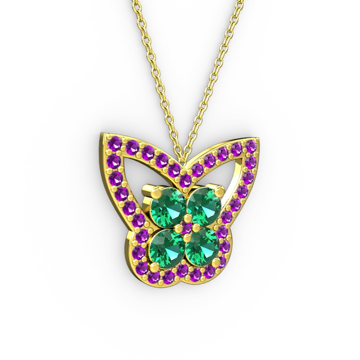 Ametist ve yeşil kuvars 18 ayar altın kolye (40 cm gümüş rolo zincir)