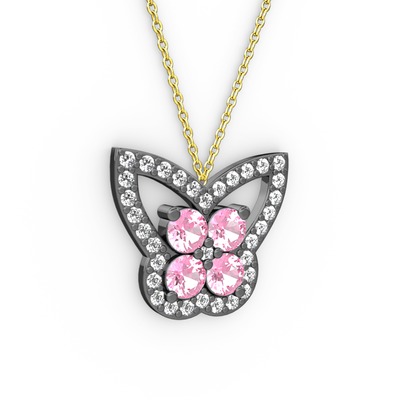 Beyaz zirkon ve pembe kuvars 925 ayar siyah rodyum kaplama gümüş kolye (40 cm altın rolo zincir)