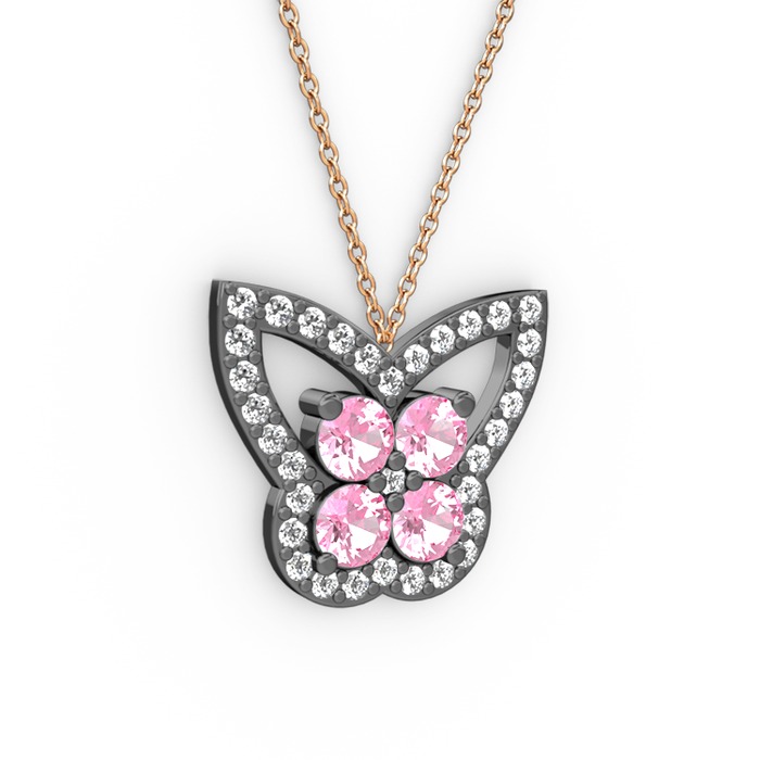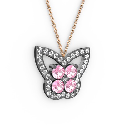 Beyaz zirkon ve pembe kuvars 925 ayar siyah rodyum kaplama gümüş kolye (40 cm rose altın rolo zincir)
