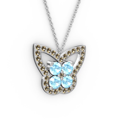 Dumanlı kuvars ve akuamarin 14 ayar beyaz altın kolye (40 cm gümüş rolo zincir)