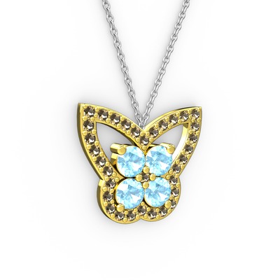 Dumanlı kuvars ve akuamarin 925 ayar altın kaplama gümüş kolye (40 cm beyaz altın rolo zincir)