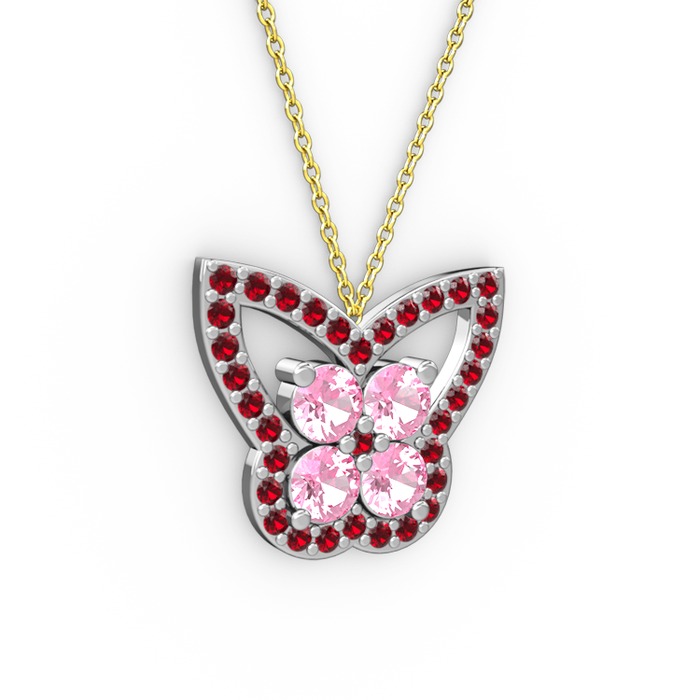 Garnet ve pembe kuvars 18 ayar beyaz altın kolye (40 cm gümüş rolo zincir)