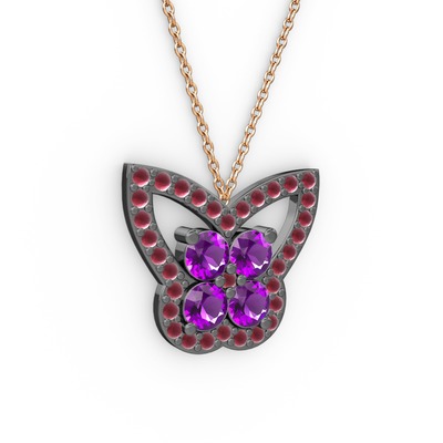 Kök yakut ve ametist 925 ayar siyah rodyum kaplama gümüş kolye (40 cm rose altın rolo zincir)