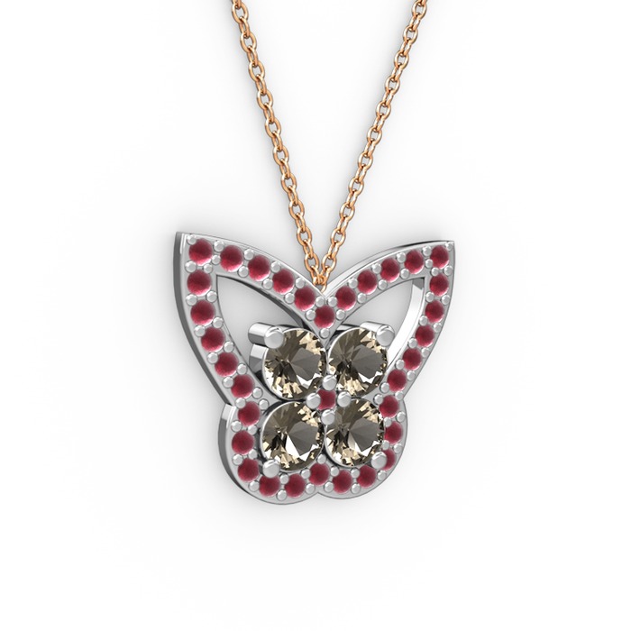 Kök yakut ve dumanlı kuvars 14 ayar beyaz altın kolye (40 cm rose altın rolo zincir)