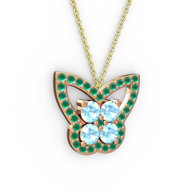 Kök zümrüt ve akuamarin 14 ayar rose altın kolye (40 cm altın rolo zincir)
