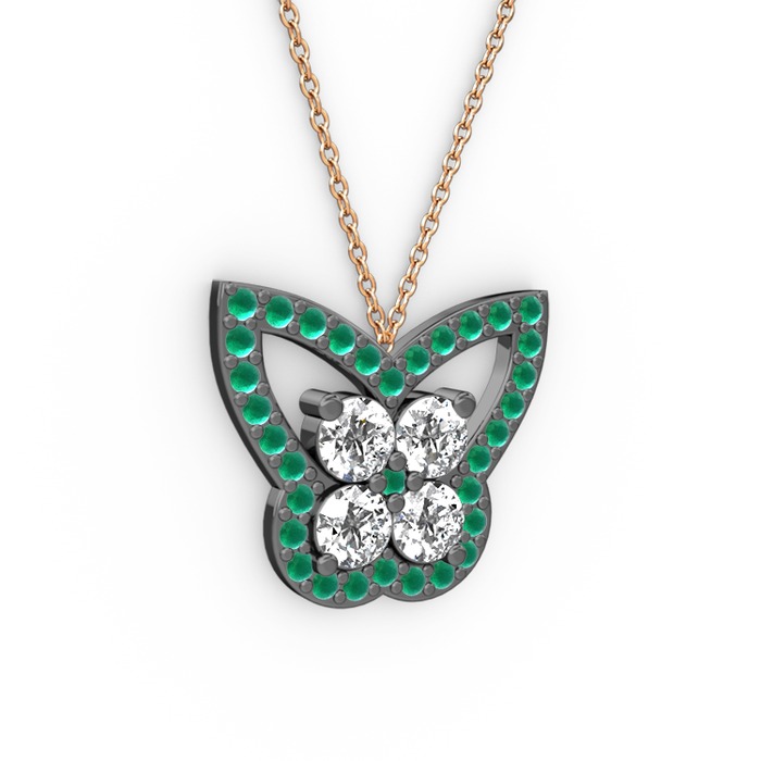 Kök zümrüt ve swarovski 925 ayar siyah rodyum kaplama gümüş kolye (40 cm rose altın rolo zincir)