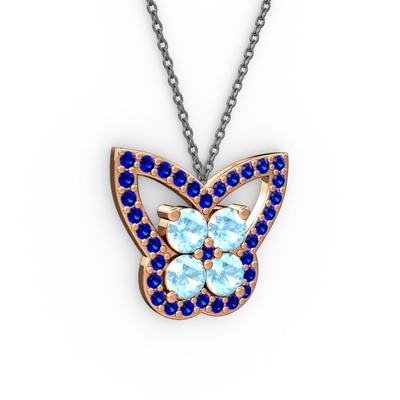 Lab safir ve akuamarin 14 ayar rose altın kolye (40 cm gümüş rolo zincir)