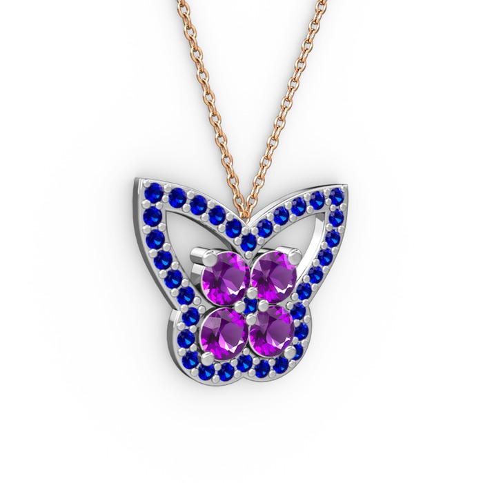 Lab safir ve ametist 8 ayar beyaz altın kolye (40 cm rose altın rolo zincir)